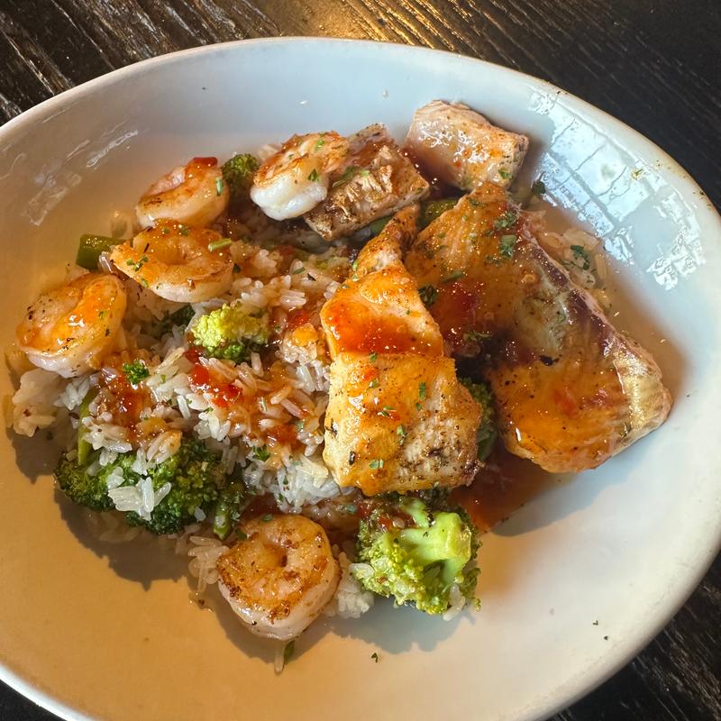 Savory smoked salmon bites paired with 5 grilled shrimp, served over a bed of jasmine rice with fresh broccoli and grilled asparagus, all finished with a sweet red chili glaze