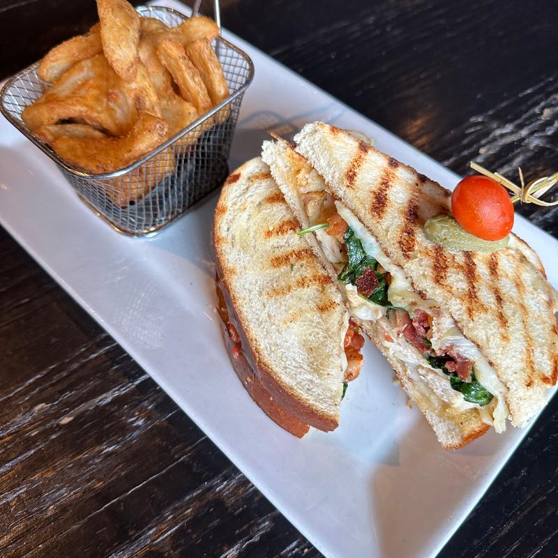 Grilled chicken layered with fresh spinach, vine-ripened tomatoes, crispy bacon, and melted mozzarella cheese, pressed on warm panini bread and finished with a spicy aioli. Served with curly fries.