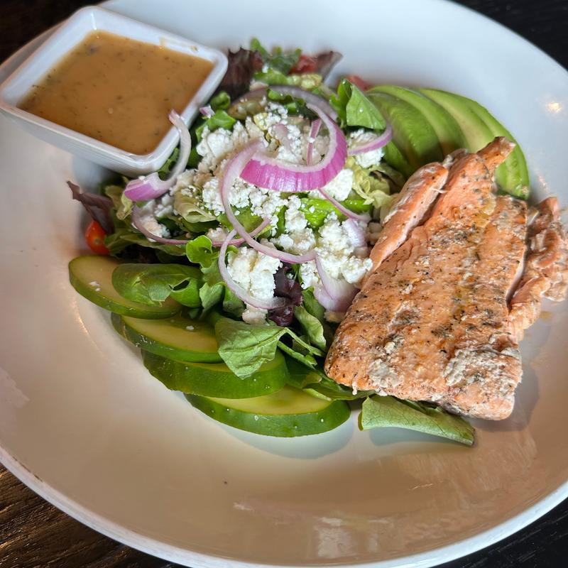 Fresh mixed greens topped with smoked salmon, crisp cucumbers, tomatoes, creamy avocado, red onions, and crumbled feta cheese. Served with your choice of dressing